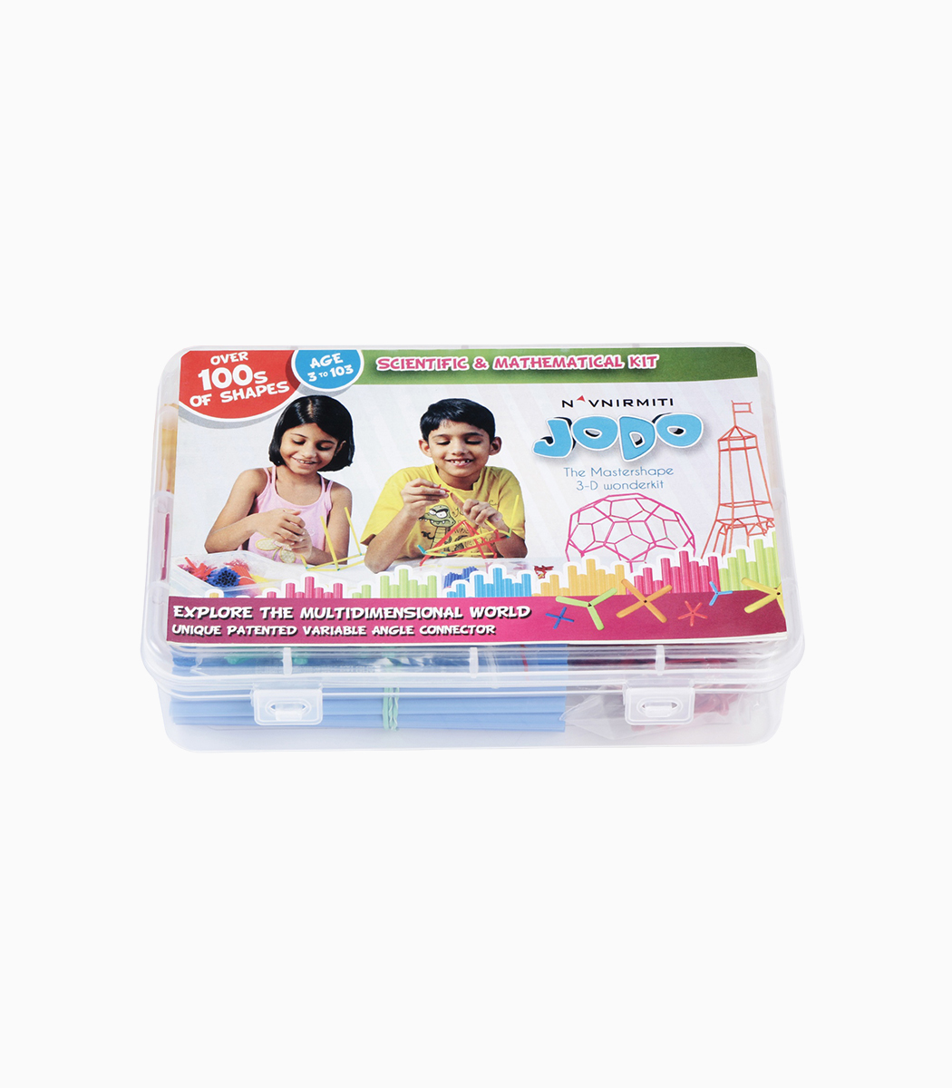 Jodo 3D, a Navnirmiti innovation, features unique variable-angle connectors that offer a fun and creative way to explore space, dimensions, proportions, and geometry. Children can easily build the 5 Platonic solids, 13 Archimedean solids, irregular solids, and endless imaginative shapes.